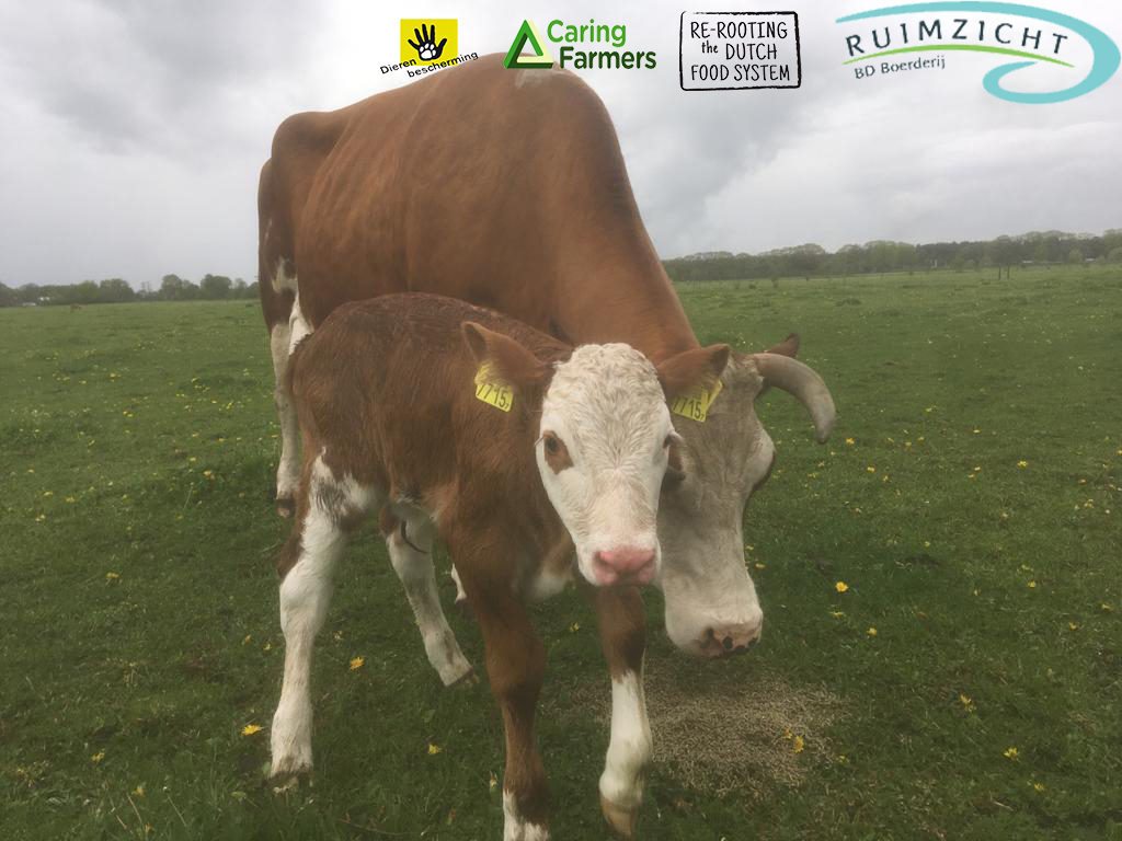 De Caring Farmers zien dat anders. Wat buiten alle realiteitszin is, is dat momenteel jaarlijks 750.000 zoogdieren van verre landen naar Nederland worden gesleept, waar ze niet mogen zogen, met veel vervuiling en antibioticagebruik worden gehouden, voor een ongewenst product. Nederlanders eten geen kalfsvlees, dat verdwijnt weer voor 90% naar het buitenland. Het moet en kan anders. Sommige Caring Farmers doen dat al en de Dierenbescherming onderzoekt hoe kalf bij de koe op te nemen in het Beter Leven keurmerk voor melkvee. Maar voor boeren is dat een grote stap waar zij hulp bij nodig hebben.